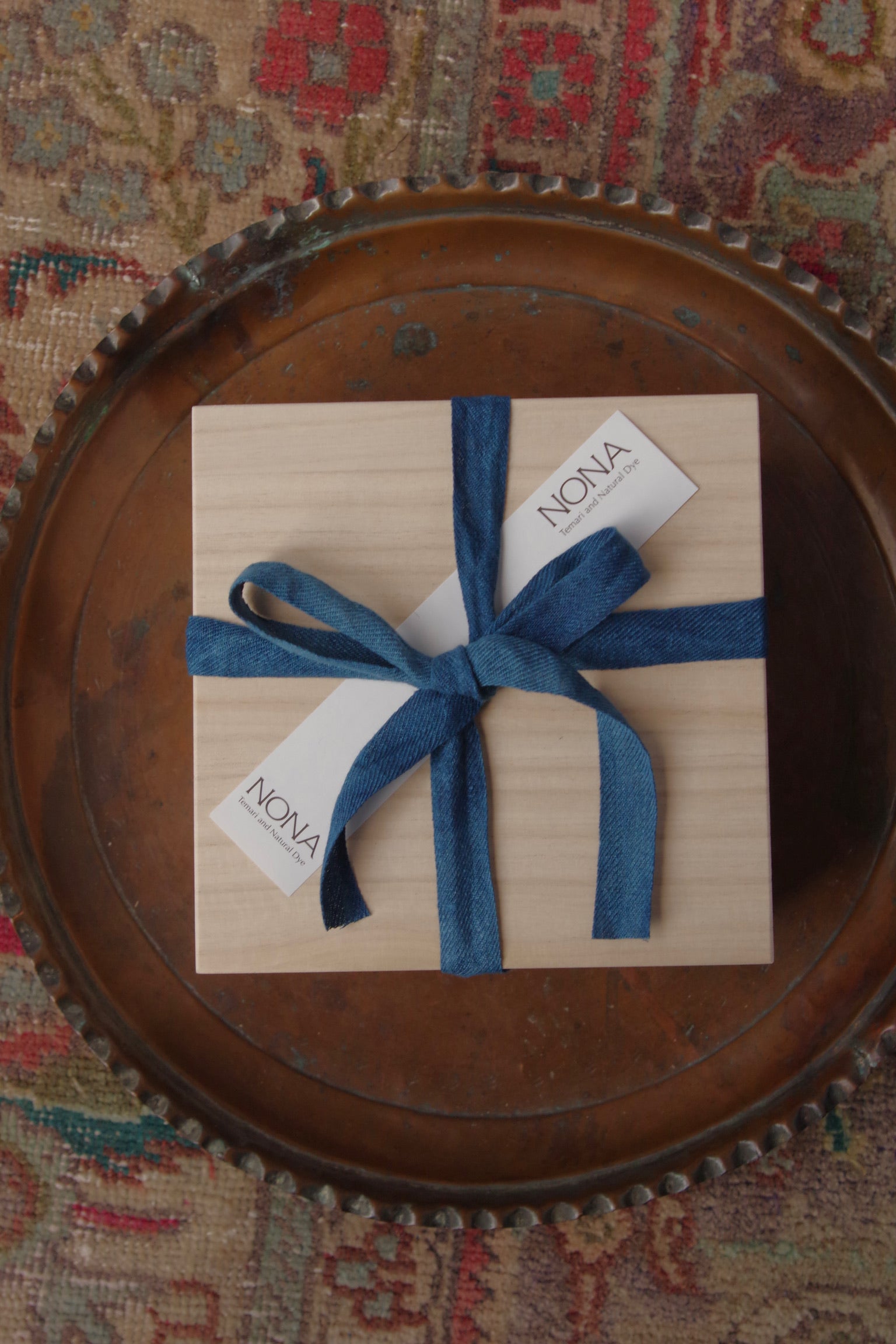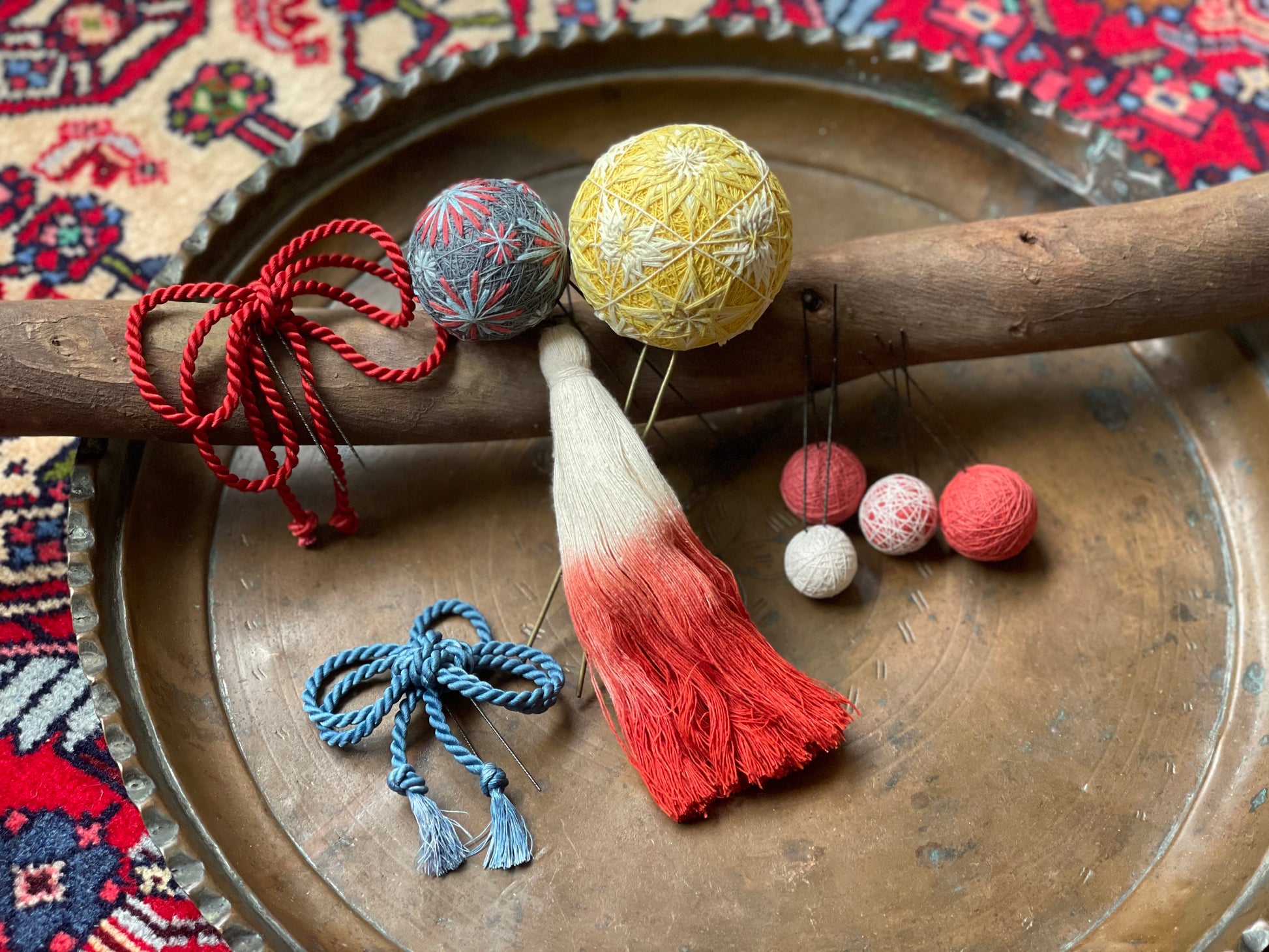 NONAの糸は全て草木染め。根を張ってしっかりと自分の人生を歩めますようにと、茜、たくさんの人に愛されますようにと藍で、シルクタッセルや水引飾りを染めあげました。